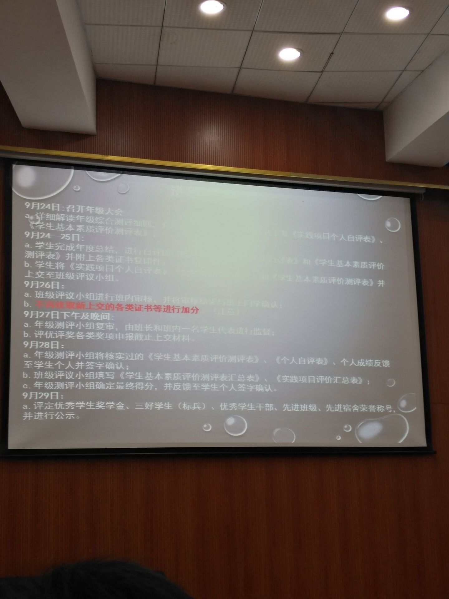 最后一部分辅导员介绍了本次评优评奖工作,评优评奖让学生们过去一年的工作学习成果得以展示,以此激励每位同学脚踏实地学习,积极参加校园活动,全方面发展自己。