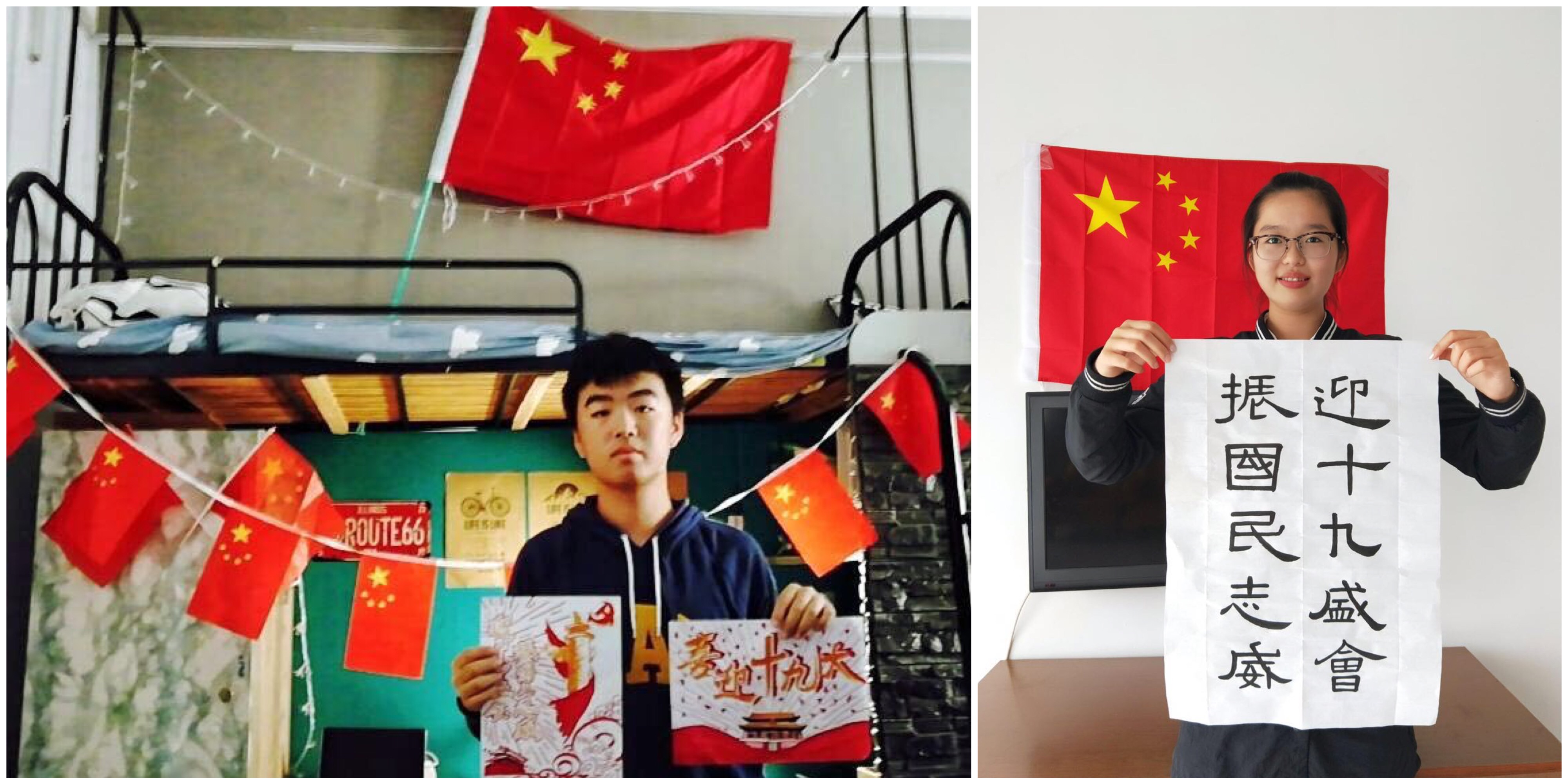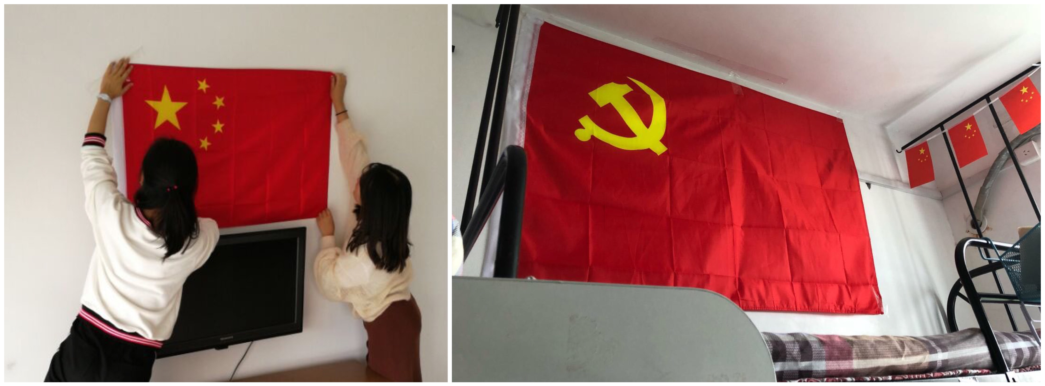 第一步骤,氛围营造 怡园18栋403、怡园17栋602宿舍的同学们将宿舍装饰一新,在大寝的客厅墙壁上悬挂上国旗和党旗,在庄严而神圣的氛围中迎接十九大的顺利召开;