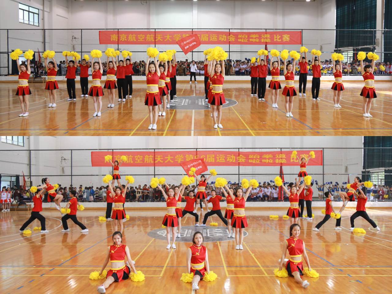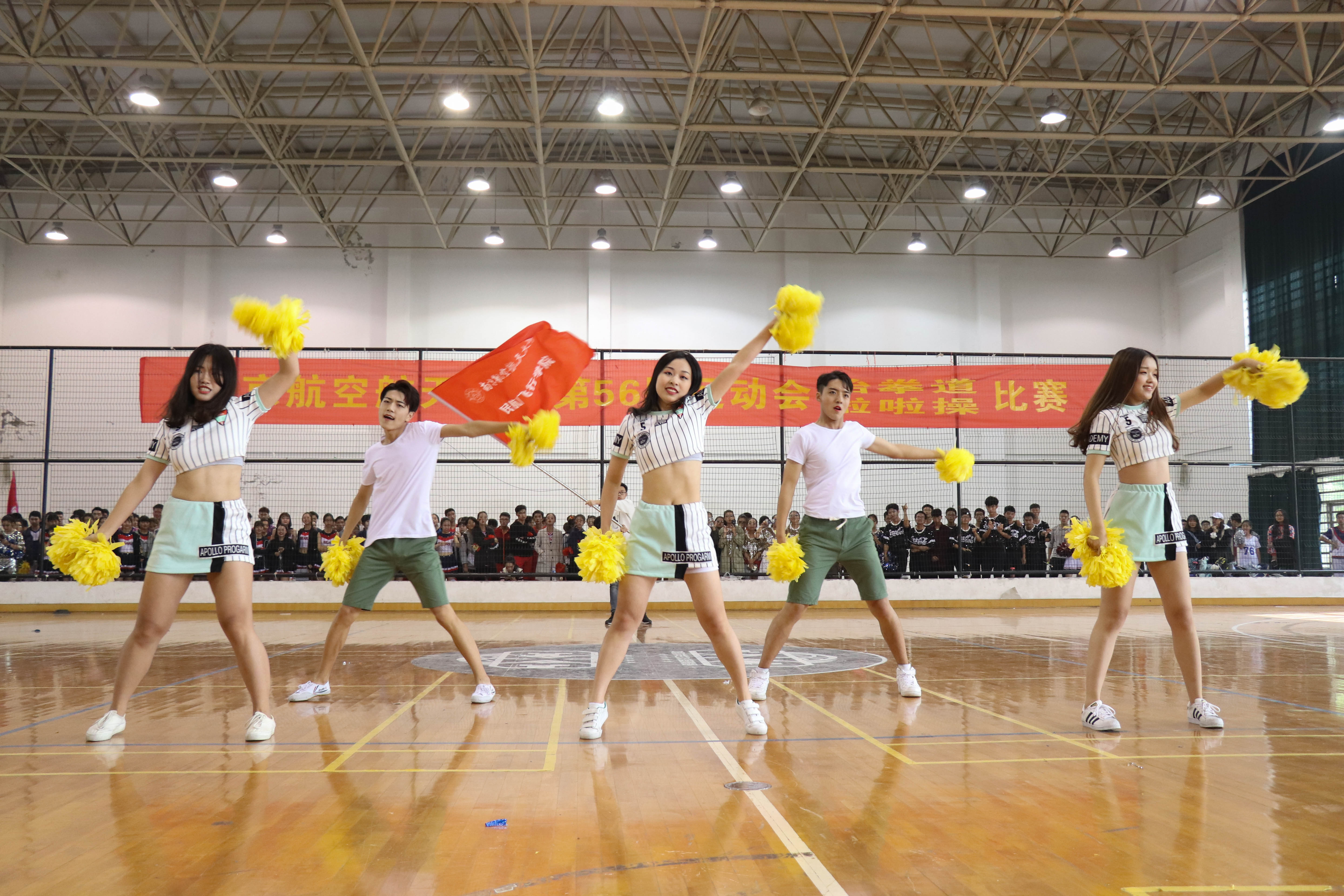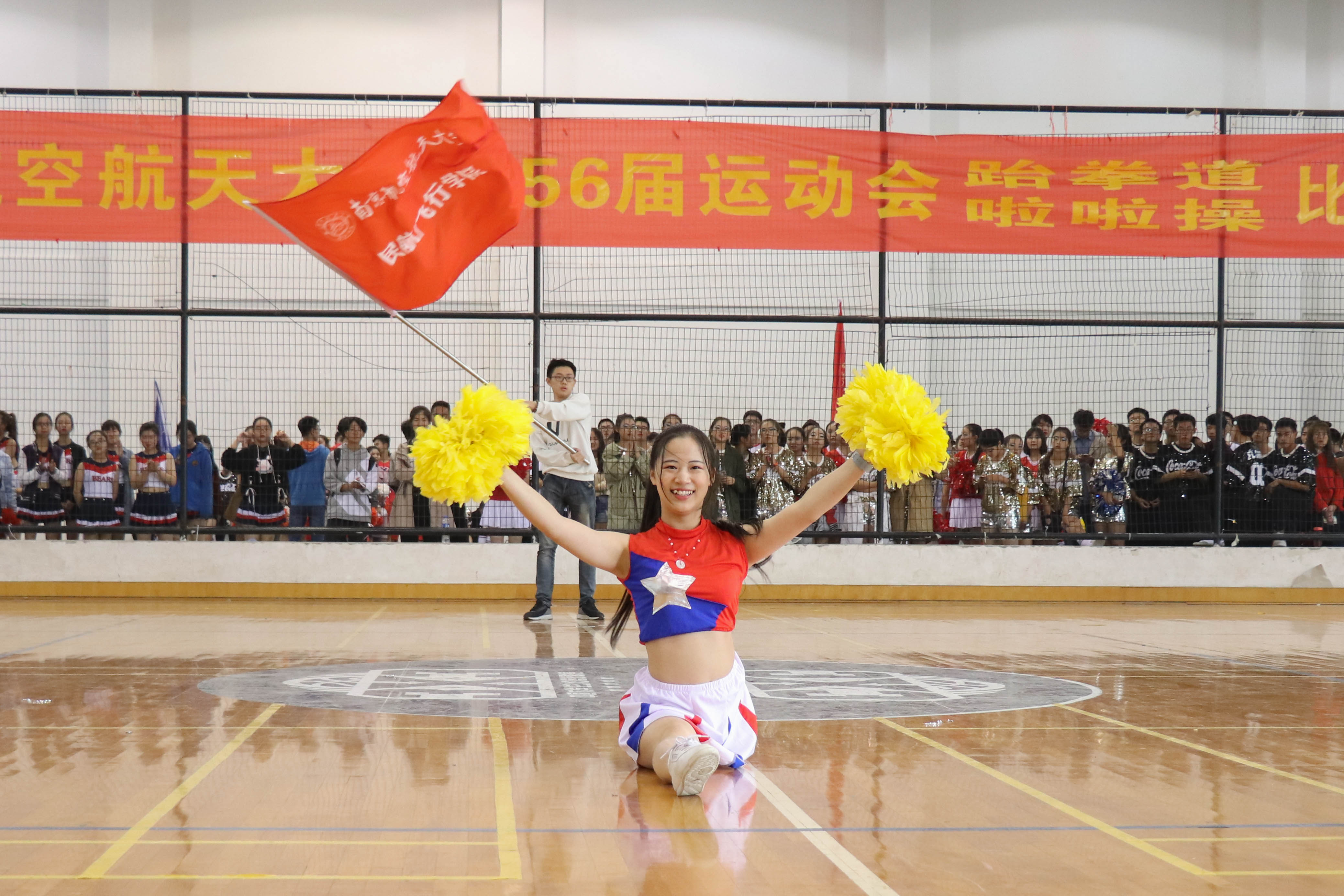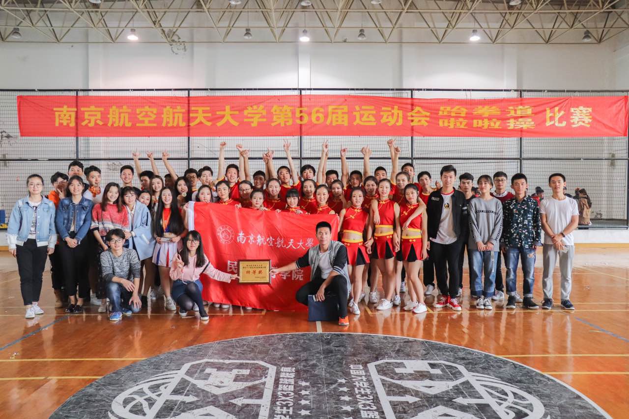 10月22号上午9点半,在十九大的召开与六十五周年校庆之际,黄色av 于将军路校区的体育中心正式举办第五十六届运动会啦啦操比赛。比赛分为小团体、单人、大团体三个项目,全校共有13个院派出代表团队参与比赛,以展现我校学子的青春风采,调动全校运动健身的良好氛围,民航飞行学院更是积极地参与到其中。