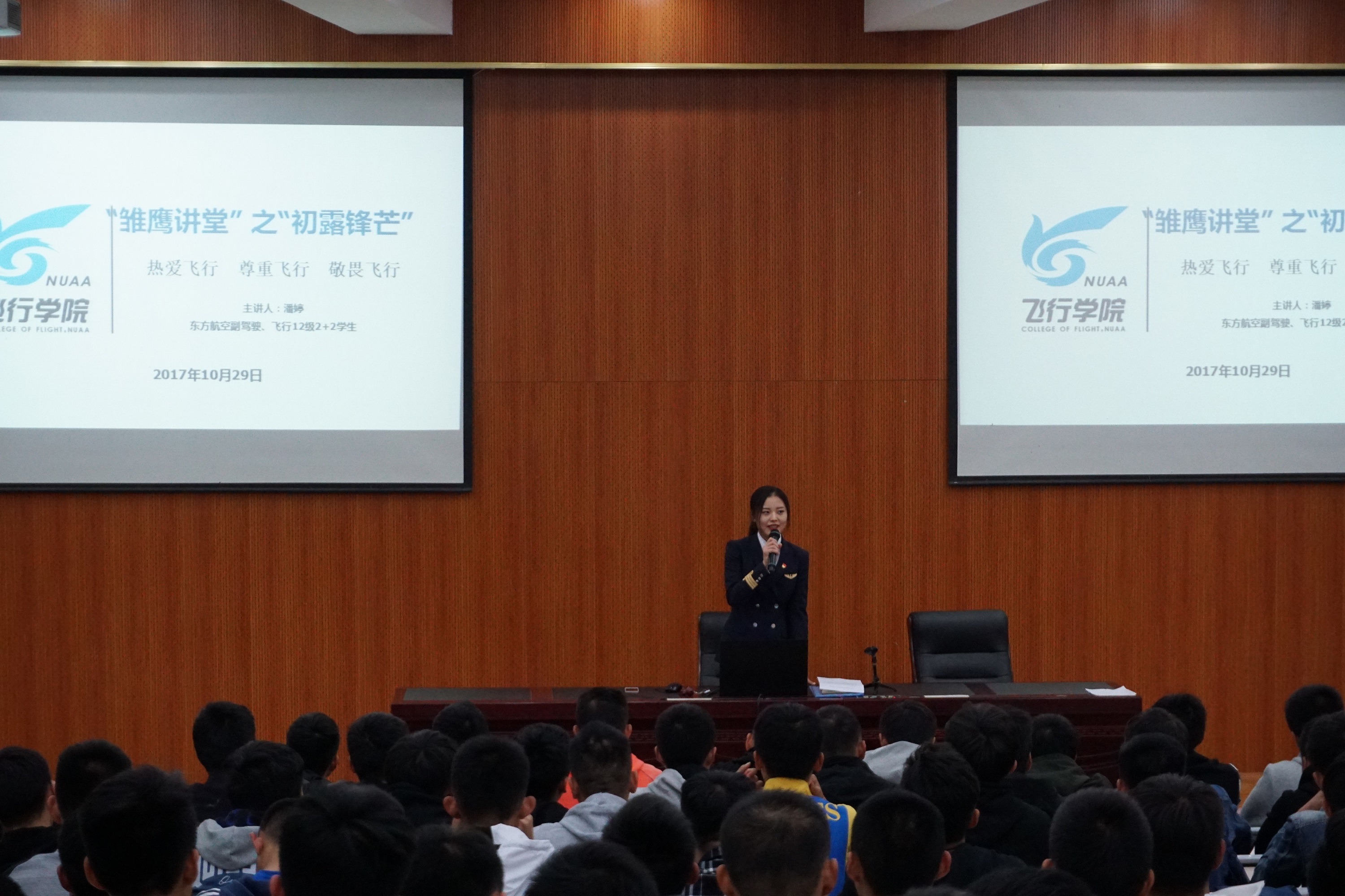 2017年10月29日晚,飞行技术专业2012级学生潘婷,现任中国东方航空江苏有限公司副驾驶,她作为“雏鹰讲堂”的第一课授课嘉宾,在我校2110教室与全体2017级飞行学生进行分享交流。