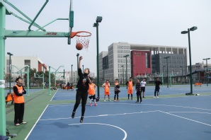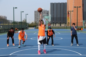 除了对抗时的激烈比拼,中场休息时的女生投篮环节,更是比赛的小高潮:一拍、一跃、一推,一个个篮球划出优美的弧线,从女球员的手中飞出,落入框中,赢得了在场同学们的阵阵掌声。
