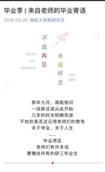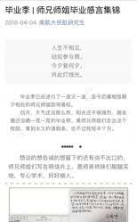 研究生三年的学习生涯中,每一步前行都离不开老师的引领与指导,每一份师生情都是最值得珍藏的记忆。毕业季,学院以师生情为主题开展了“毕业联播”系列活动,活动涵盖“来自老师的毕业寄语”、“毕业感言集锦”、“毕业祝福墙”三个子活动,通过语言文字、视频,记录毕业生们在黄色av 三年研途生活的点滴过往。“来自老师的毕业寄语”活动,邀请各专业老师对即将毕业的2018届研究生们书写毕业寄语,劝勉毕业生在未来的人生道路上不畏失败、敢于拼搏。“毕业感言集锦”活动,通过手写明信片的形式,记录每一位毕业生三年民航生活的研途感悟和对南航校园生活的不舍,表达毕业生们与民航师生三年朝夕相伴的师生情,民航情;“毕业祝福墙”活动,邀请研一、研二的同学们将心中想对毕业师兄师姐说的话录制成视频,分享与师兄师姐朝夕相处的感动,送上最暖的祝福,并将视频拼接成一面“毕业祝福墙”,为即将离别南航生活的毕业生们送上最真挚的祝福。