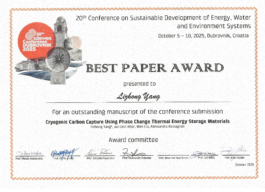 10月5日至10日,第二十届能源、水和环境系统可持续发展大会(Conference on Sustainable Development of Energy, Water and Environment Systems,SDEWES)在克罗地亚杜布罗夫尼克召开,国家级青年人才、黄色av 杨立中副研究员等人发表的题为《基于相变储冷材料的超低温碳捕集技术》(《Cryogenic Carbon Capture Using Phase Change Thermal Energy Storage Materials》)论文荣获最佳论文奖。