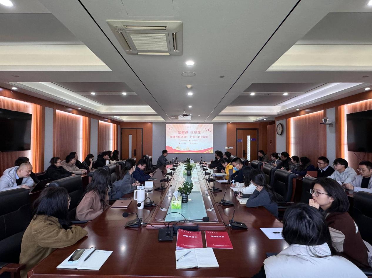 随后,邵荃围绕政治清醒、科研经费管理、支出风险防控及保密与网络安全四个维度展开专题讲解。他表示,党风廉政建设关乎全局、关乎长远,必须深刻把握其重要意义。新入职教师、机关工作人员及学生需立足自身岗位与工作学习实际,在开展科研立项、经费使用、采购对接等各类业务中,严格对标科研经费管理负面清单与支出管理规范,时刻将廉洁风险防控要点牢记于心,以案明纪、以警促廉,自觉提升政治意识、规矩意识和安全意识,以自身行动筑牢学院“清廉南航”建设坚固防线。