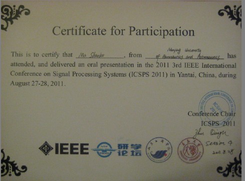 IEEE信号处理系统国际会议(ICSPS 2011)是每年一度的最先进的信号处理系统研究的国际论坛,它是为展示在信号处理系统等领域的新发展和国际最领先信号处理系统水平的国际会议之一。首届会议在新加坡举行,第二届在中国大连举行,第三届在中国烟台举行,大会致力于为信息系统管理、信息技术处理等领域的专家和学者提供一个学术交流与建立友谊的平台,展示在信号处理系统领域的新进展以及动向。会上,马少博同学作为作者代表发言,与广大学者分享优秀的论文和成果,共同探讨近来信号处理和信号系统等领域的新技术和新应用,发言得到了与会专家的一致好评。